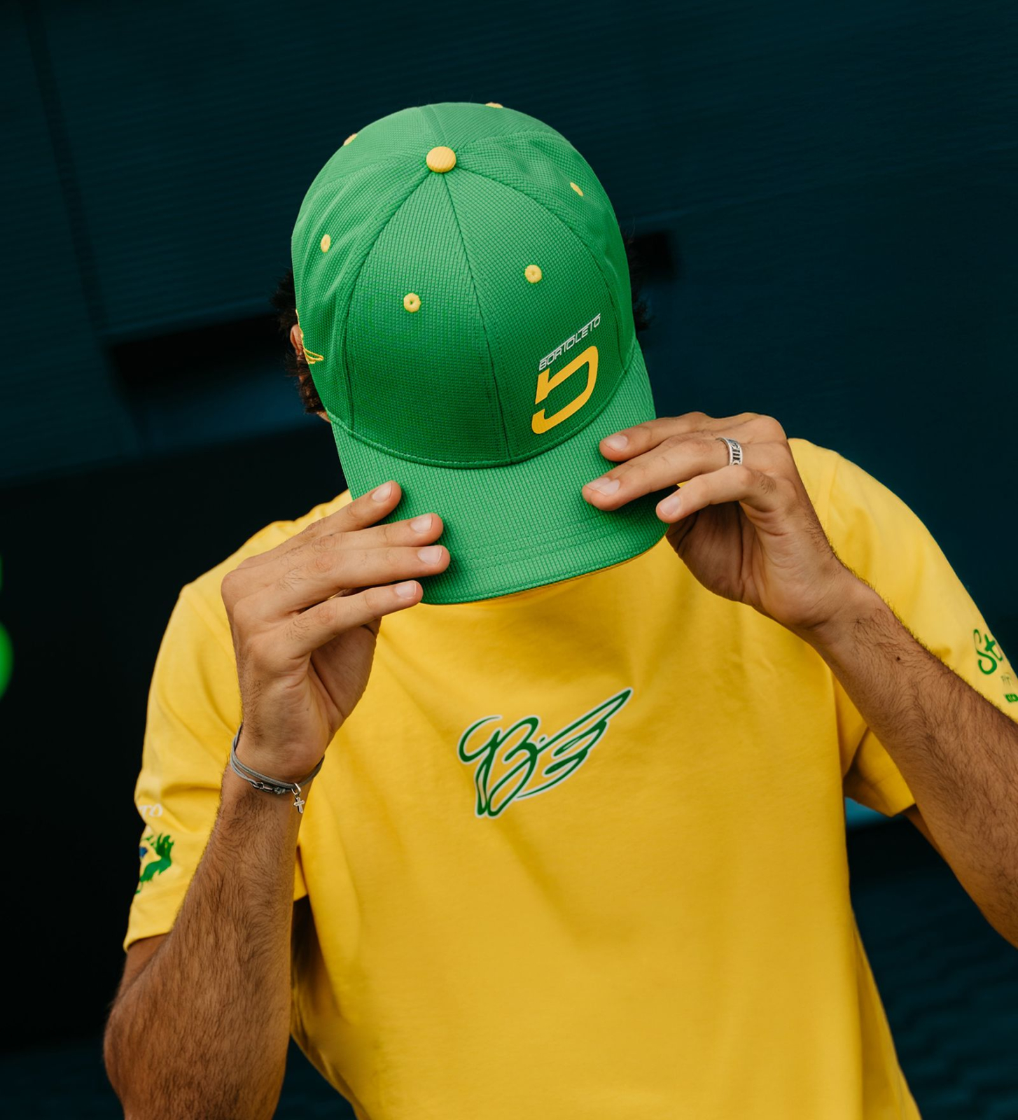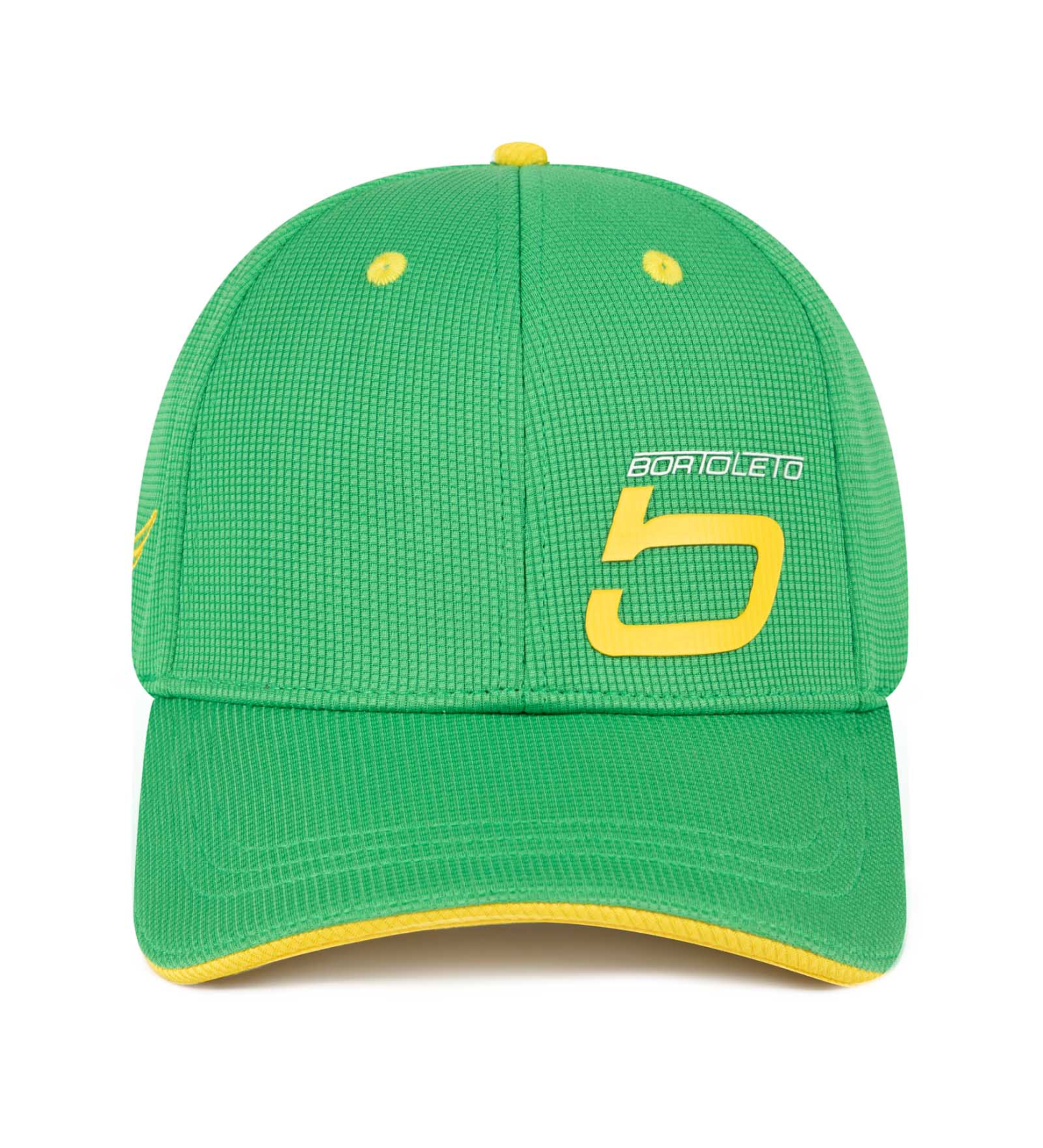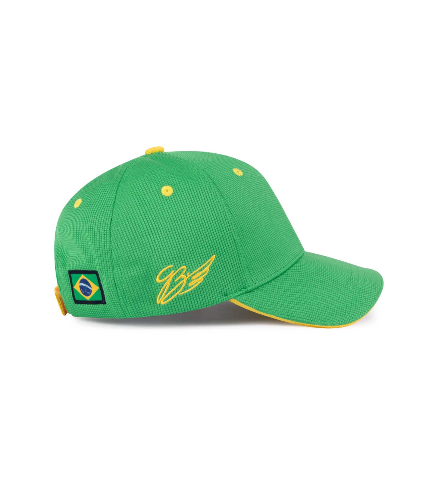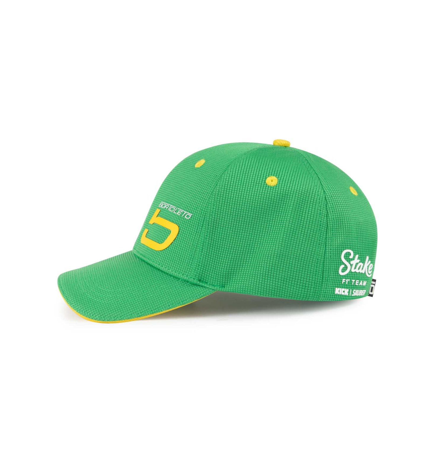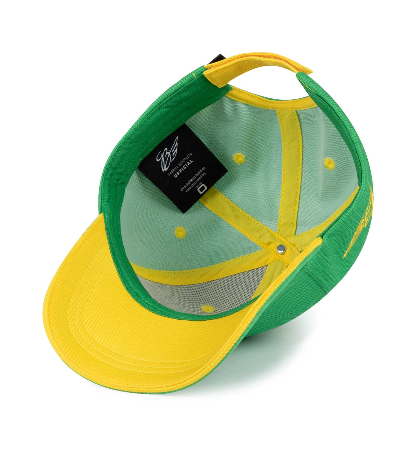 Confecționată din 100% poliester pentru confort pe tot parcursul zilei, șapca prezintă numărul 5, semnătură a pilotului Bortoleto, brodat în galben vibrant pe față. Logo-ul său personal decorează lateralul, în timp ce spatele afișează cu mândrie atât steagul brazilian, cât și logo-ul echipei Stake F1 – un omagiu adus moștenirii și echipei sale. Partea inferioară galbenă a cozorocului curbat și cureaua galbenă reglabilă cu velcro completează designul dinamic.