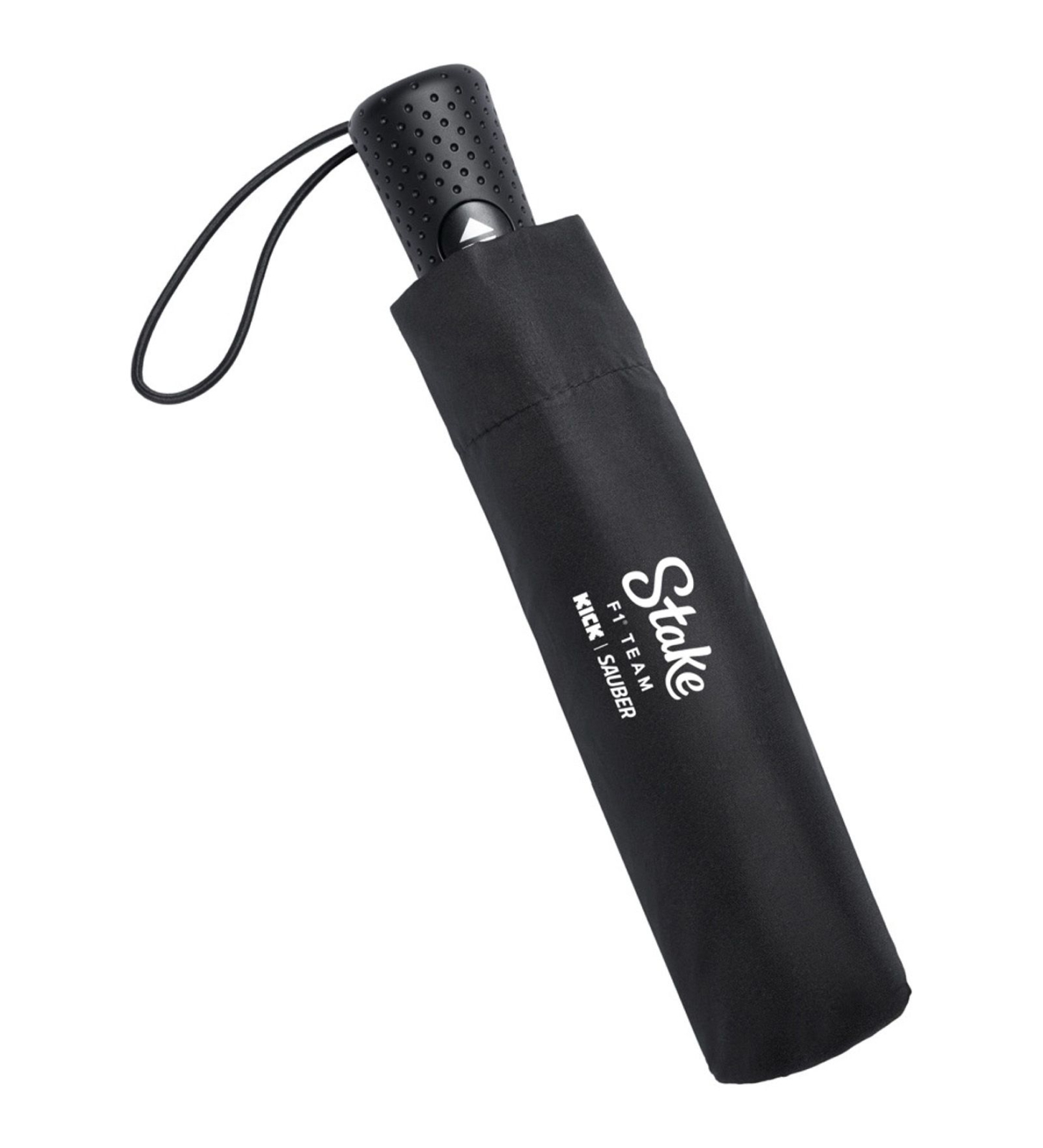 Umbrela compactă oficială se mândrește cu un design elegant de culoare neagră și prezintă cu mândrie sigla echipei Stake F1 pe patru din cele opt panouri. Materialul de înaltă calitate este compus din 100% poliester, conferind nu doar un aspect sofisticat, ci și subliniind durabilitatea acestuia. Mecanismul automat de deschidere asigură o manevrare convenabilă, în timp ce nervurile metalice negre oferă stabilitate umbrelei. Designul ergonomic al mânerului garantează o prindere confortabilă, iar pentru depozitare practică, este disponibilă o husă mică din poliester pentru a ascunde cu grijă umbrela.