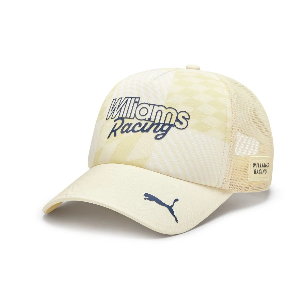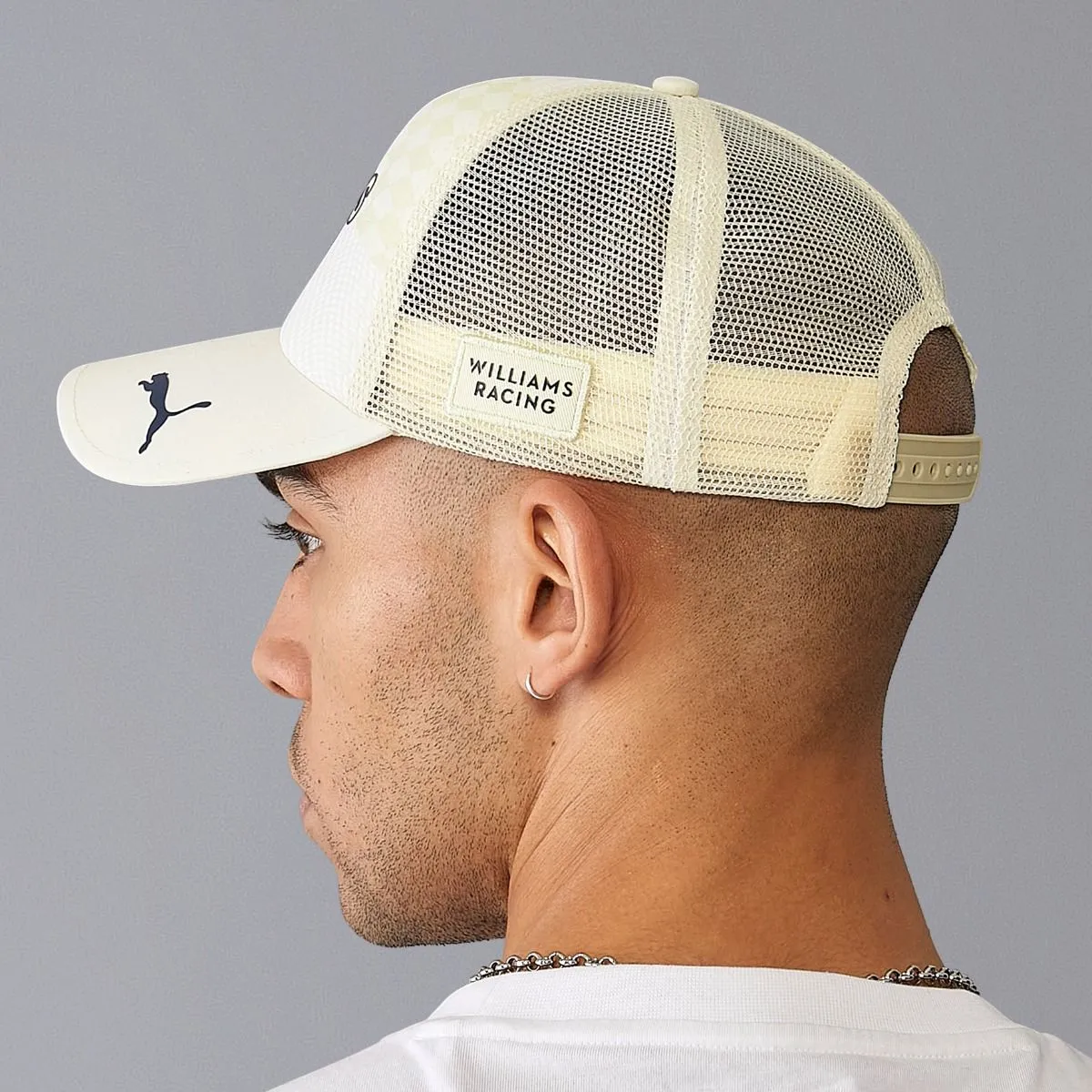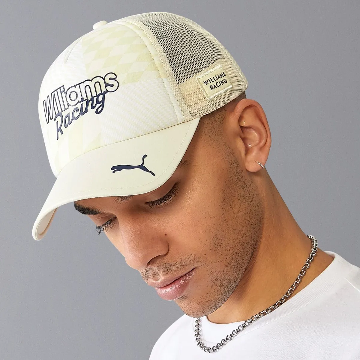Șapca sezonieră combină panourile spate din plasă în stil clasic „Trucker” și panoul frontal alb contrastant cu un logo Williams Racing inspirat din moștenirea sa și un imprimeu cu steag în carouri derivat din motorsport.